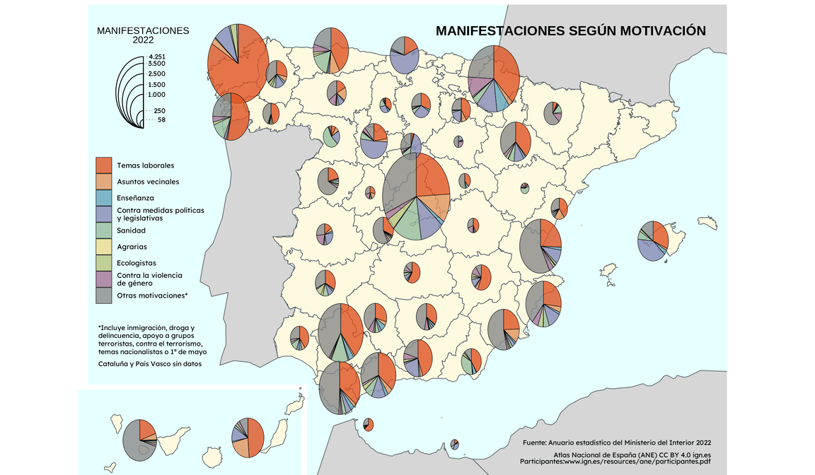 Map graph with pie charts from Spanish National Atlas (ANE) that shows protests motives distribution across spanish provinces in 2022. The represented data comes from the 2022 statistical yearbook on protests published by the Spanish Ministry of Interior.