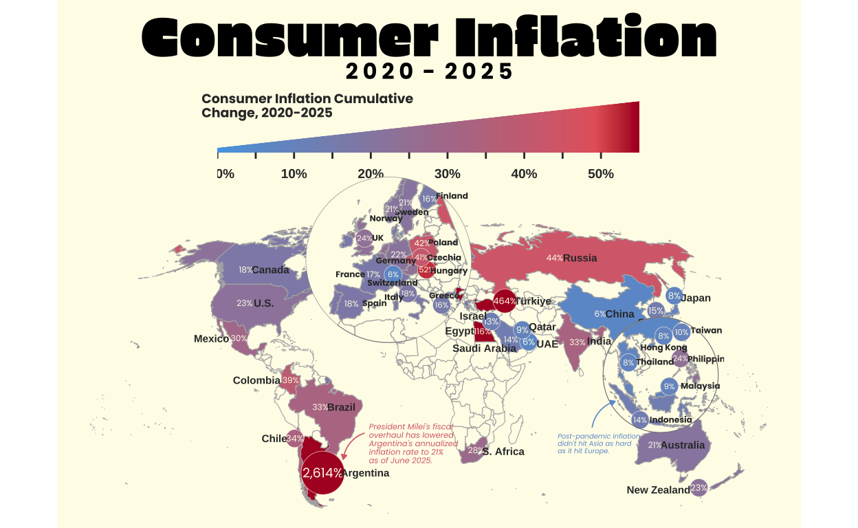 World map visualization of consumer inflation from 2020 to 2025