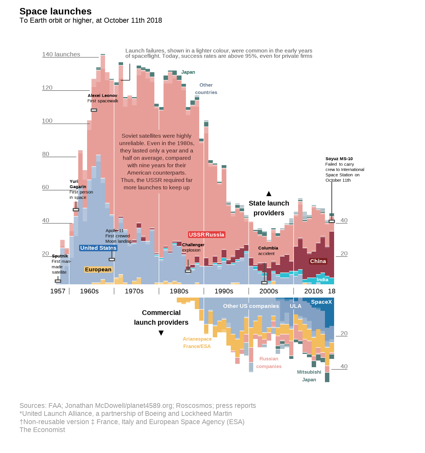 A snapshot of global space launches from 1957 to 2018, highlighting the shift from Cold War superpower dominance to a space race led by rising powers and private companies.