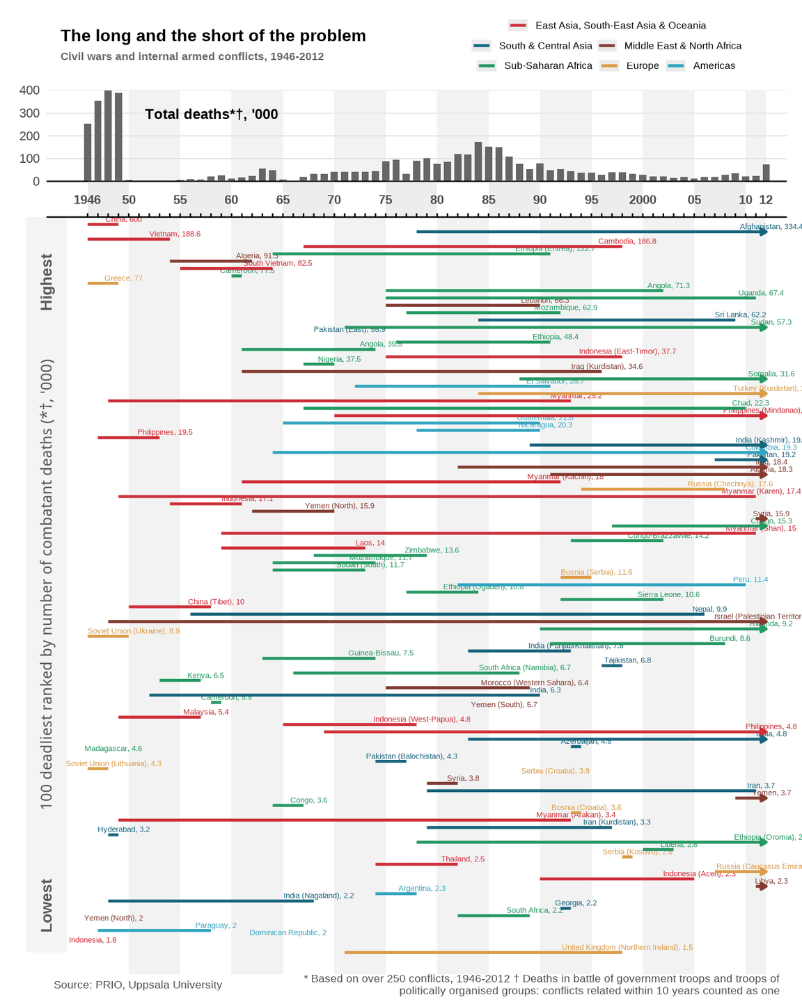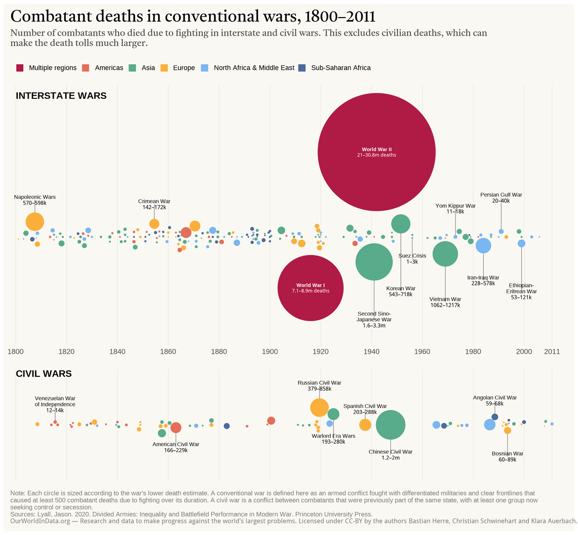 Number of combatants who died due to fighting in interstate and civil wars. This excludes civilian deaths, which can make the death tolls much larger.