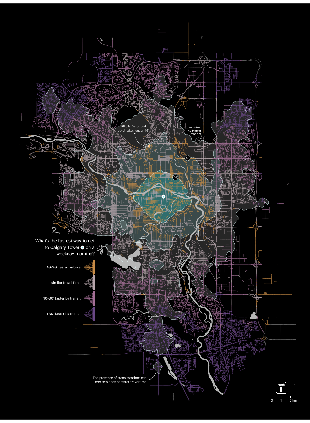A visualization of travel times by bike and transit in the city of Calgary.
