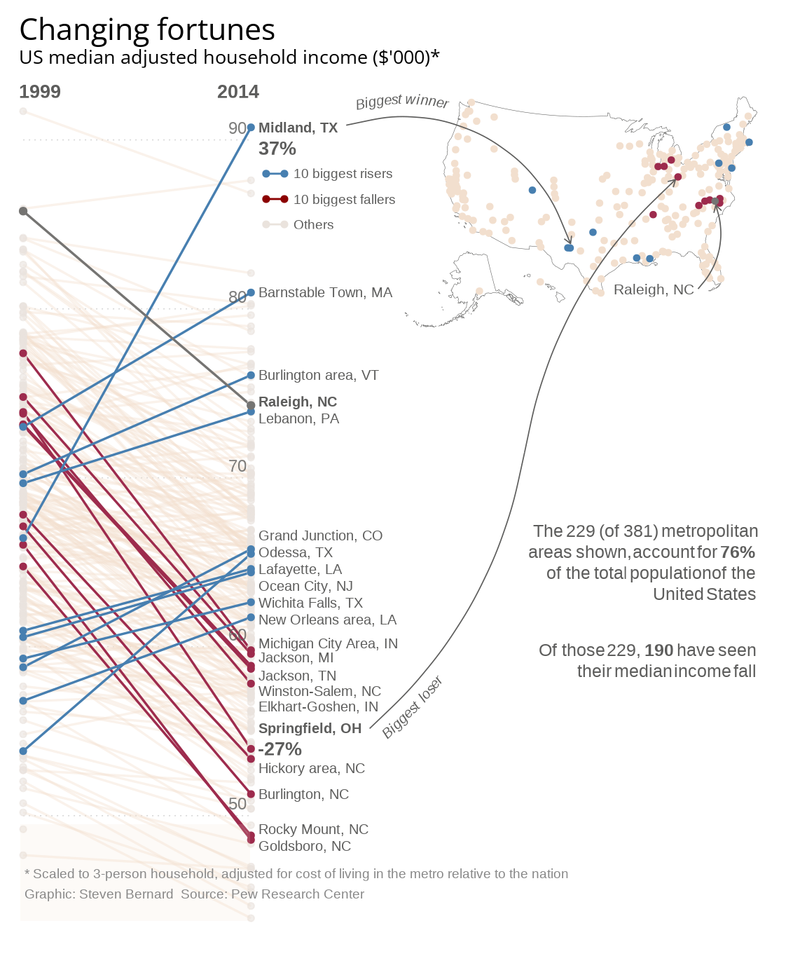 In this article I explain how I replicated a New York Times chart in R and the process of creating a different chart with ggplot2 with the same data. I'll also explain the limitations of replication and alternative visualization, and discuss the strengths and weaknesses of both charts, based on data visualization theory.