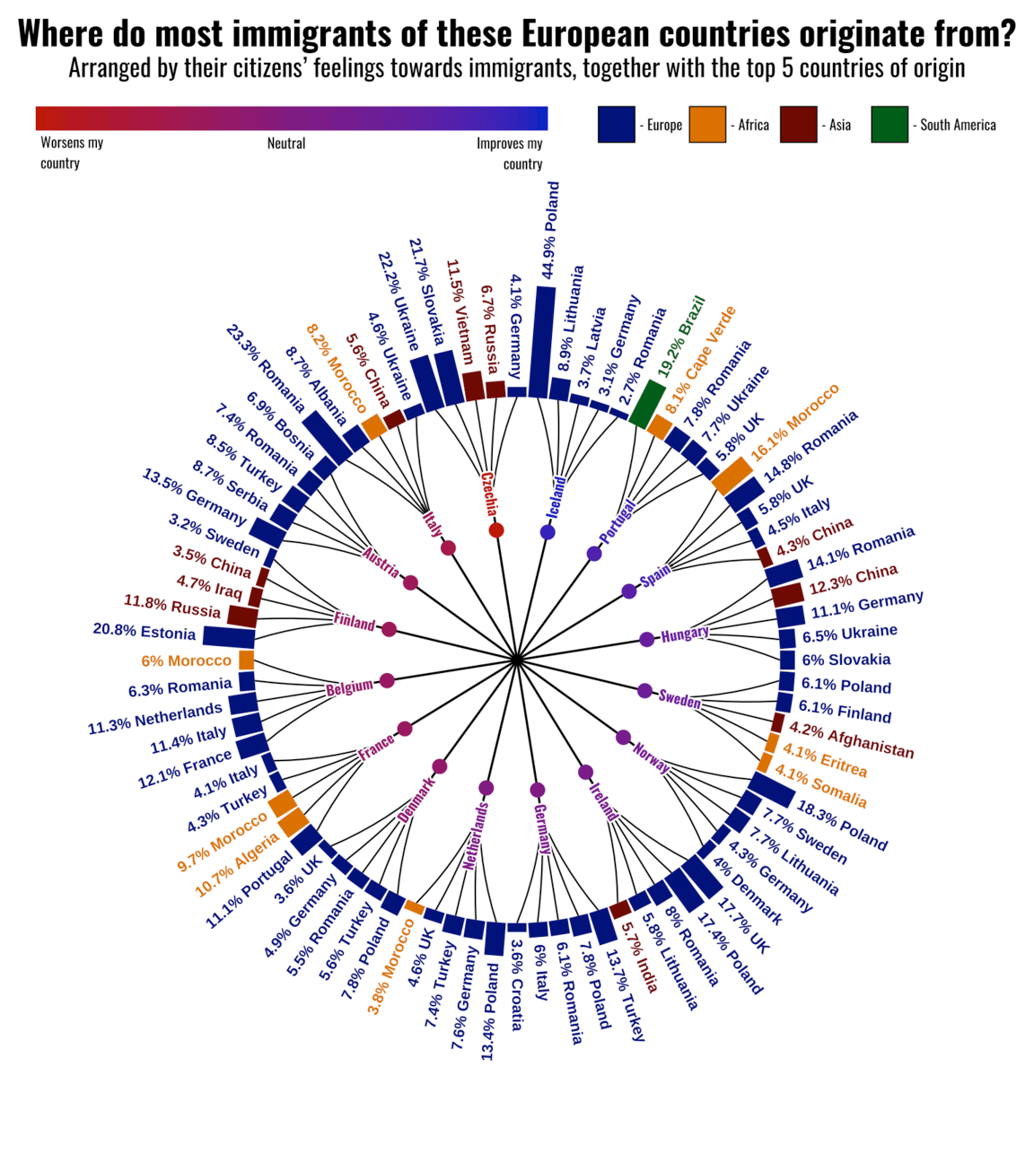 This project recreates and then reimagines a circular barchart showing European countries' immigration attitudes and top immigrant origin countries. All data is from 2018.