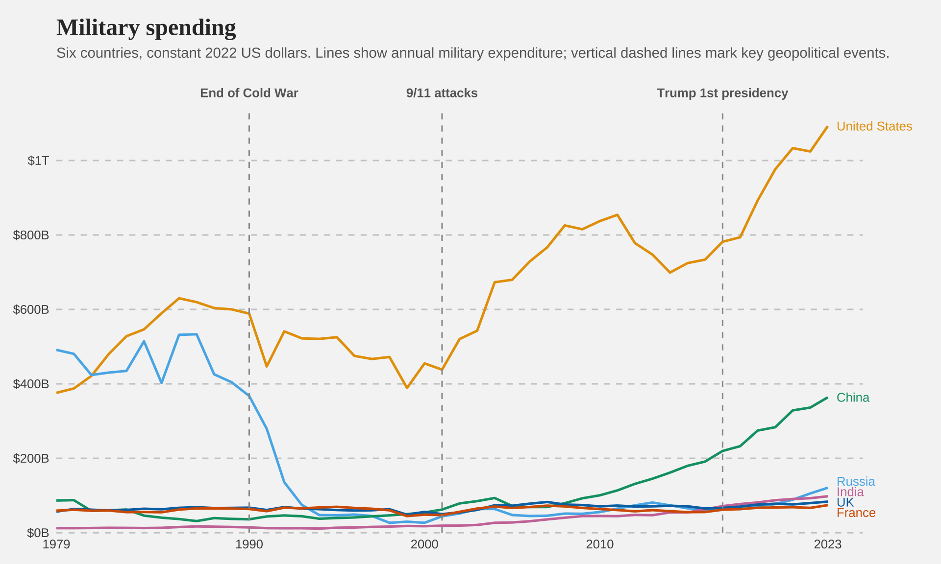 Reproducing and improving a chart on military spending from Our World in Data.