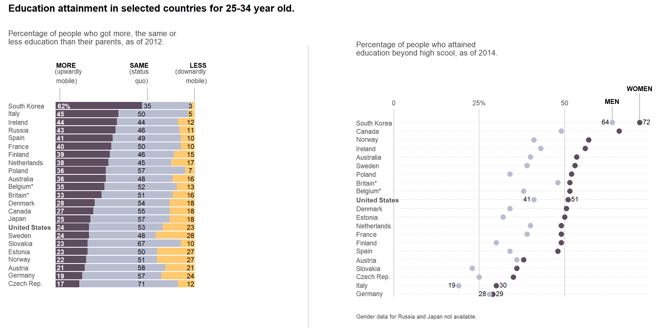 The graph for this project was inspired by a New York Times article about education mobility and gender differences in education. The first part of the article talks about how young students’ highest level of education compares to their parents’ highest level of education. Students who achieved a higher level than their parents are considered upwardly mobile, those who achieved the same level are considered to have experienced status quo mobility, and those who achieved a lower level are considered downward mobile. The second part of the article examines gender differences in education at a specific level. You can find the full article here.