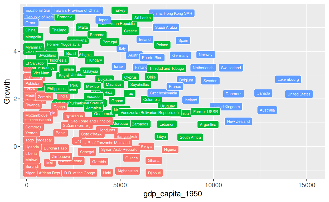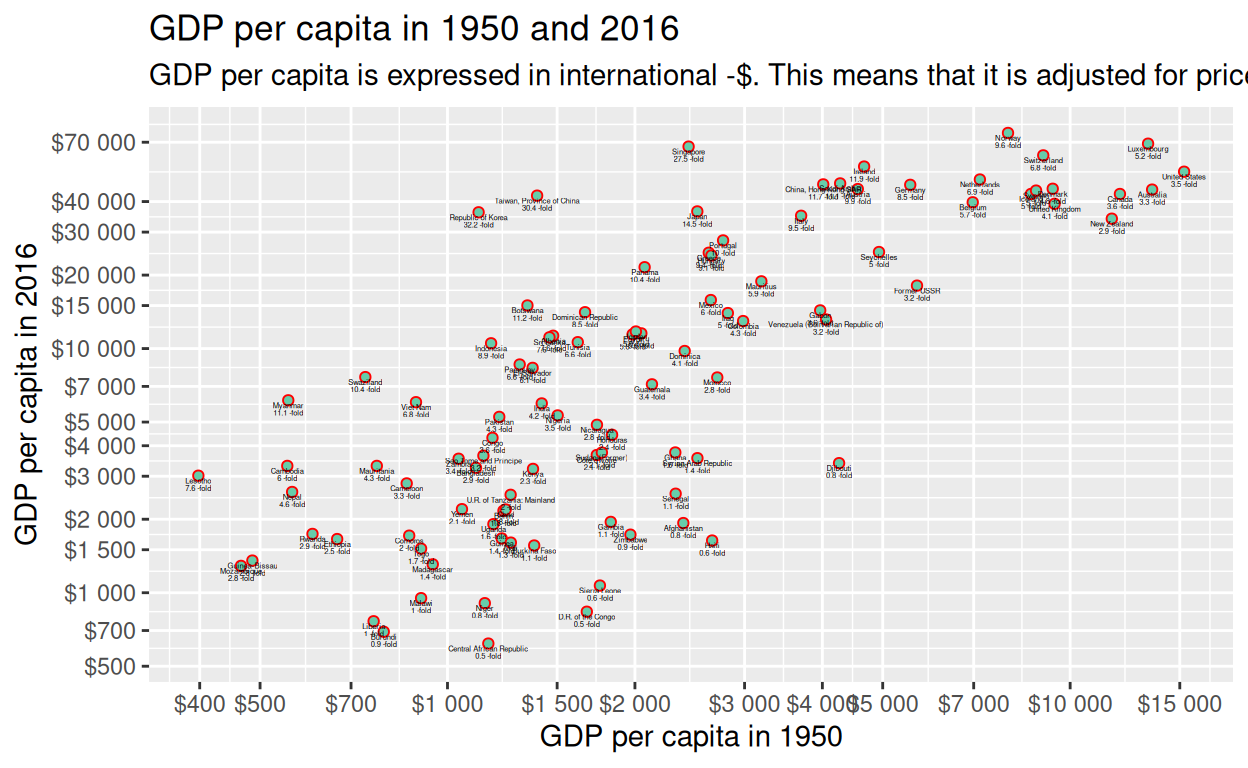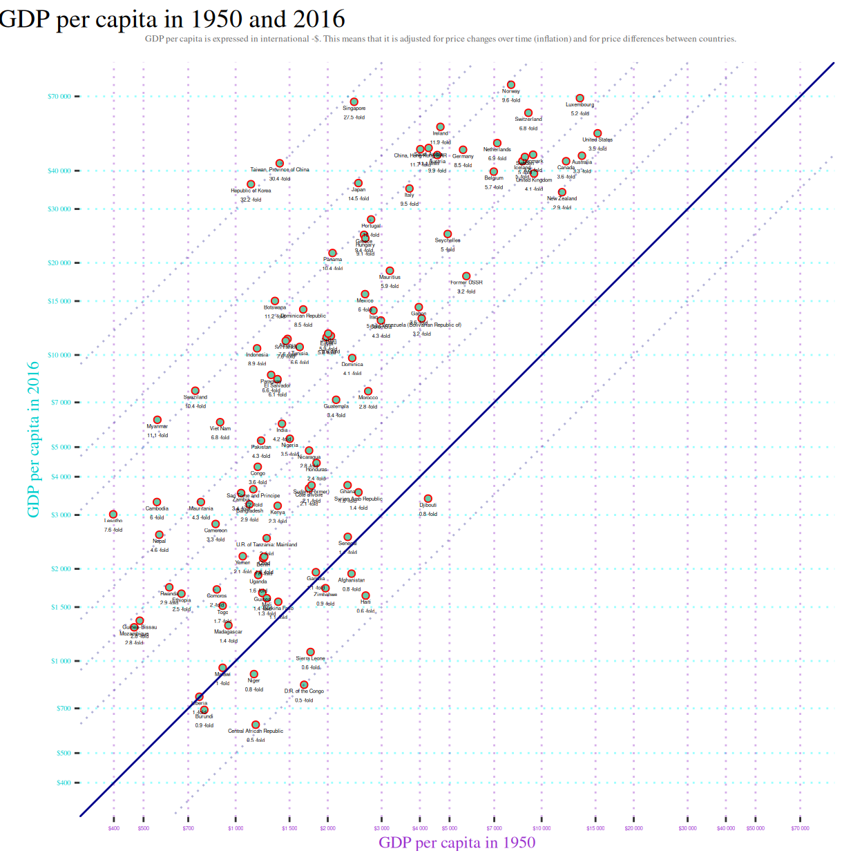 Our plot requires a lot of labels inside the graph, both for lines and for points. We will take advantage of geom_text() and add some label to the geometry including a subheading accounting for the amount of growth each economy has undergone. We will later work on our annotations to the diagonal lines.