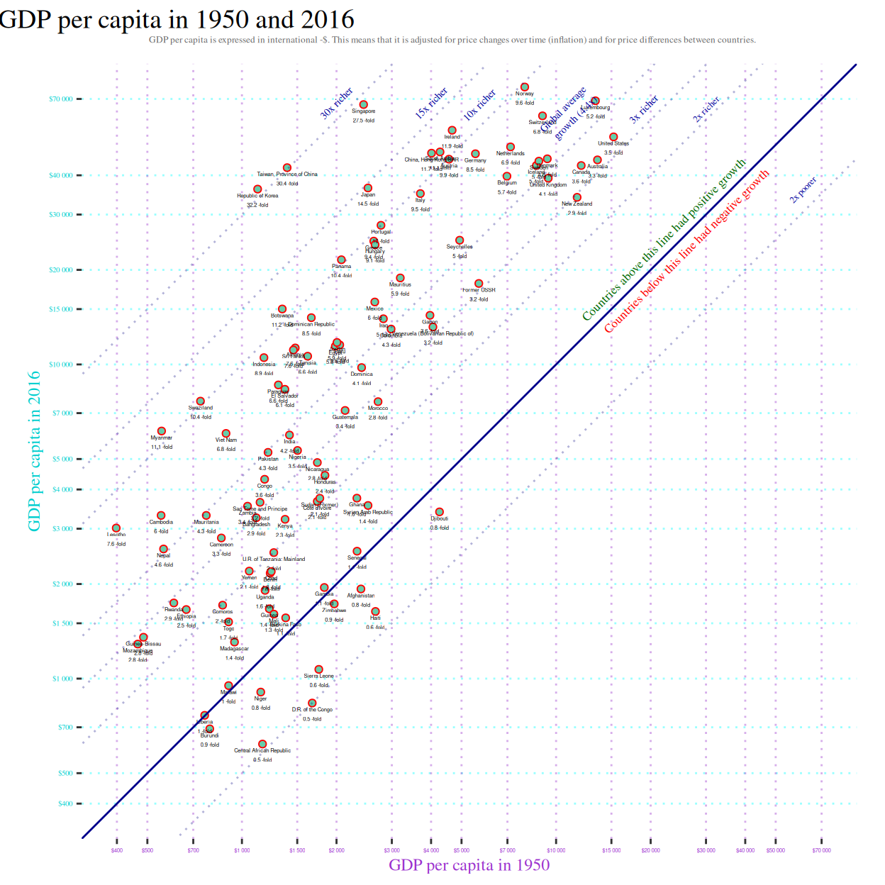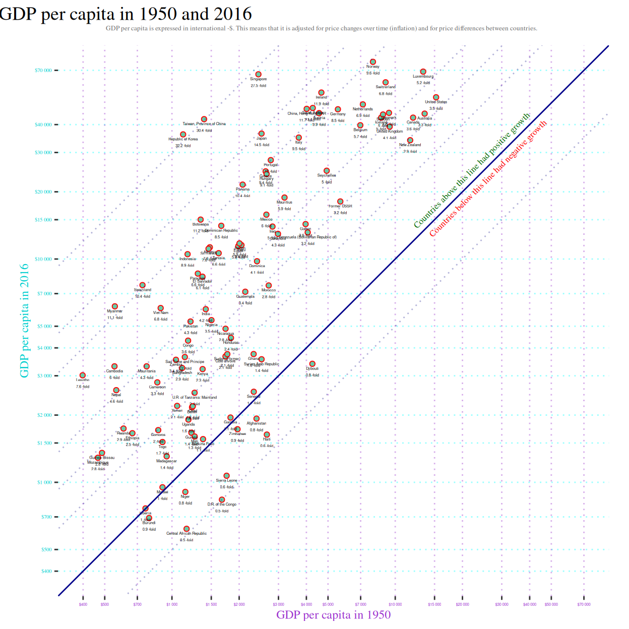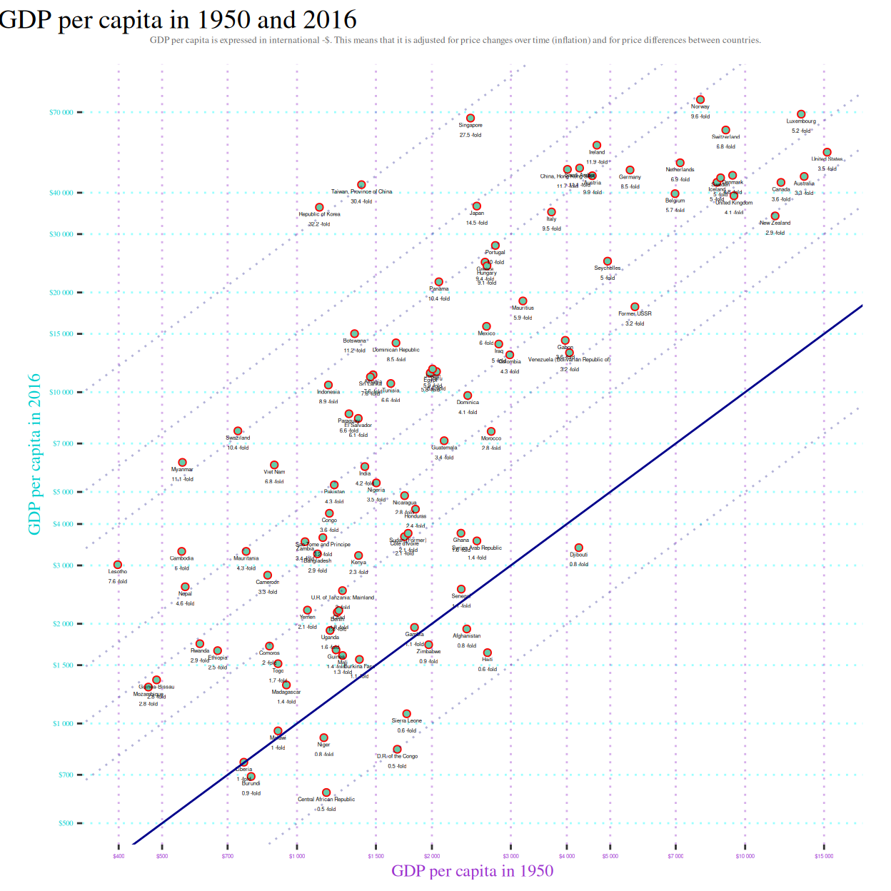 We will now work on the annotations accompanying the vertical lines which will indicate the amount of growth that each of the countries have experienced since 1950, thus, conveying the idea of convergence/divergence among them.