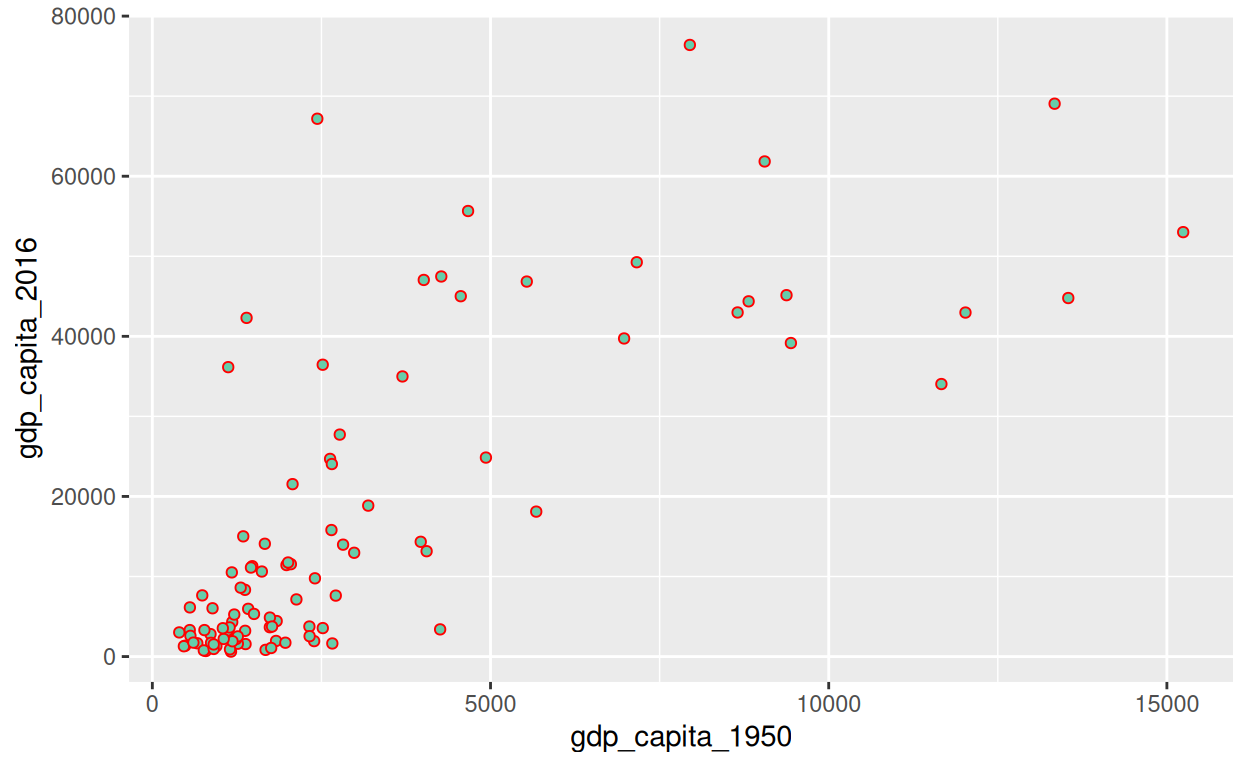 A prior step to develop our plot will be to clean and sort the data to prepare it for our ggplot() operations. We will filter for rows containing data for 1950 and 2016 and reshape the data to have two columns accounting for GDP per capita for each country and for each year. This enables the analyst to depict a different axis for each of the years containing observations on GDP per capita.