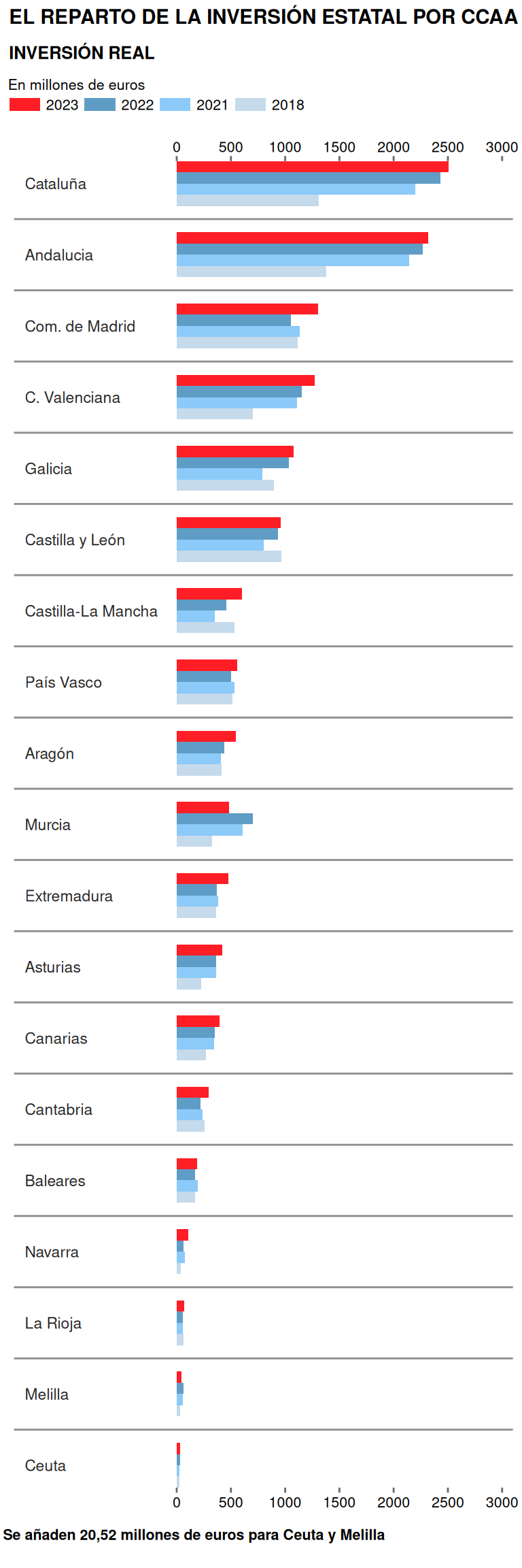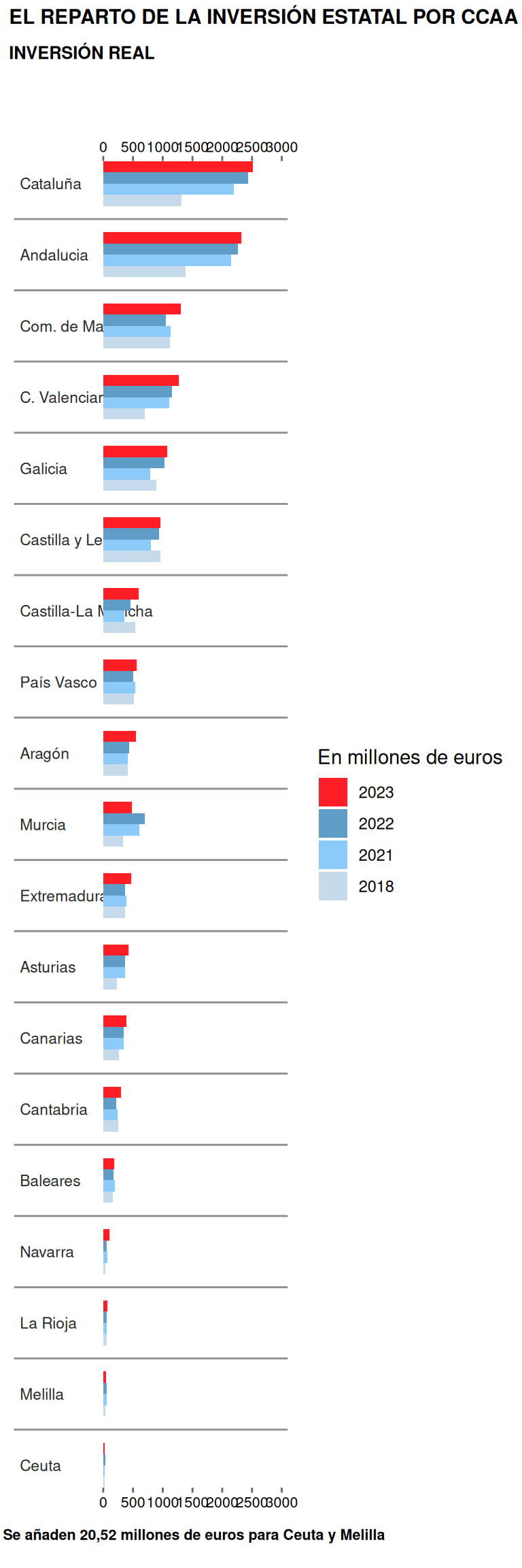 The point here, is in the differences between Madrid and Catalonia. However, as illustrated here, the budget from Catalonia is closer to Andalusia rather than Madrid. We can see notices of this kind in the national press channel “Catalonia and Andalusia lead state investment with almost twice the budget of Madrid and the Valencian Community” or the “El Mundo” from which I took the graph.