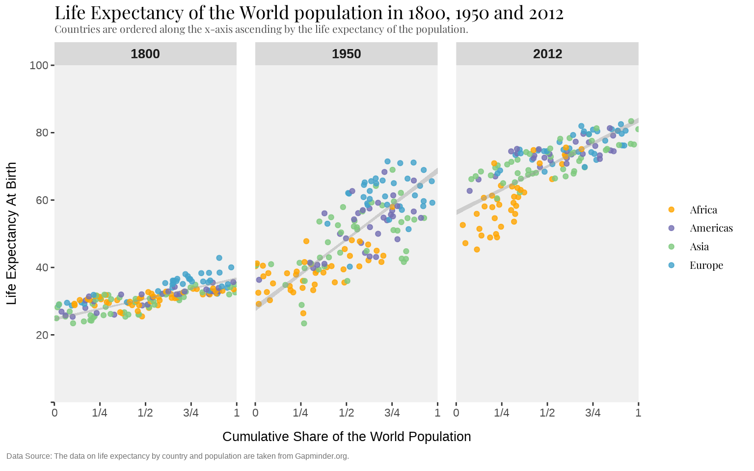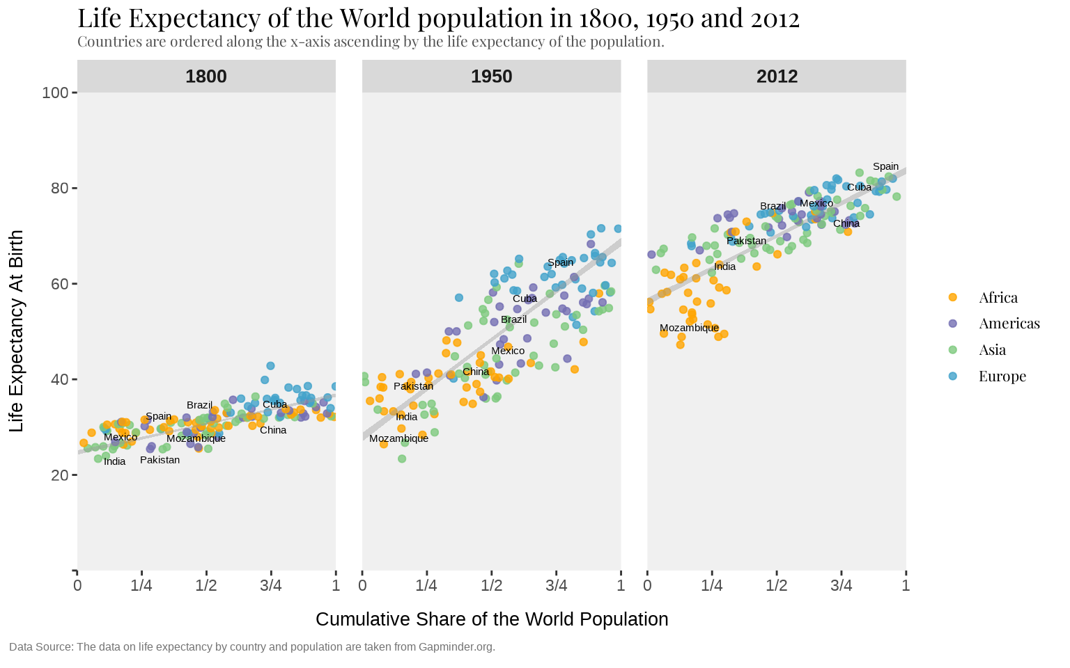 Since the x-axis of the original plot represents the cumulative share of the world population, where countries are ordered by ascending life expectancy, some transformations are needed to compute it. This way, data are ordered by increasing life expectancy for each of the years and subsequently the cumulative share of the world population is computed.