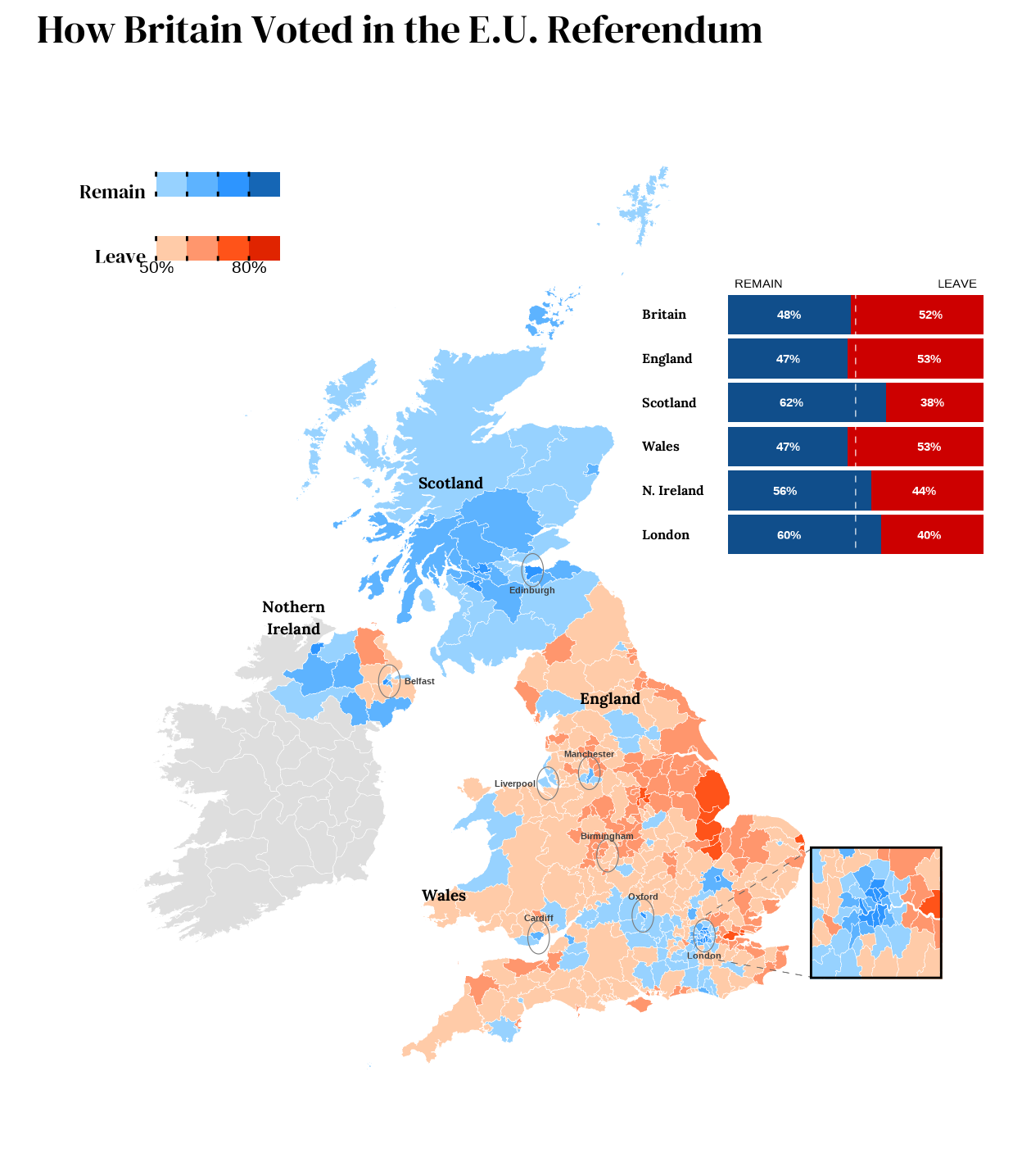 The original graph can be found on the New York Times graph repository and uses maps and charts to illustrate the voting patterns across various regions, highlighting stark divisions between areas that voted to remain in the European Union and those that opted to leave and providing a detailed breakdown of the results of the Brexit referendum in the United Kingdom.