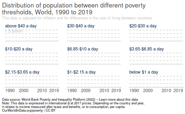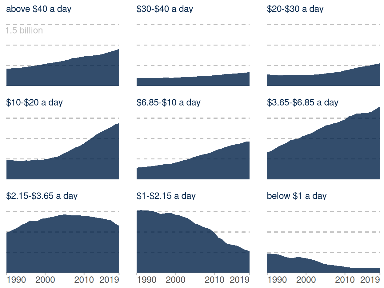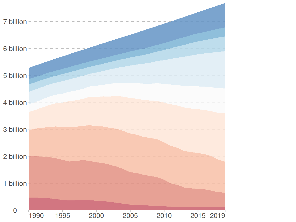 The original graph can be found on the web page of Our World in Data. It, visually, portrays how daily disposable income has been globally distributed between 1990 and 2019. One major strength of this graph is that, at a glance, one is able to see, tentatively, historical developments of each disposable income bracket in relation to each other.