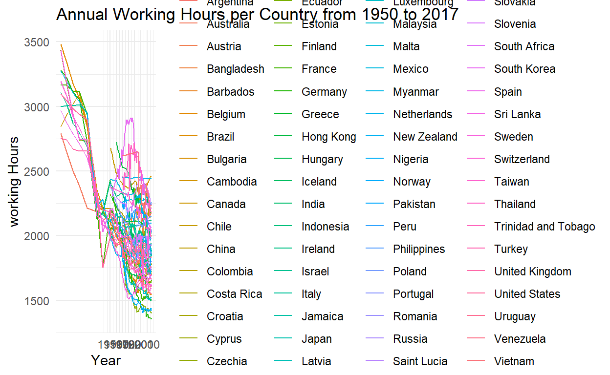 labs(title = "Annual Working Hours per Country from 1950 to 2017",