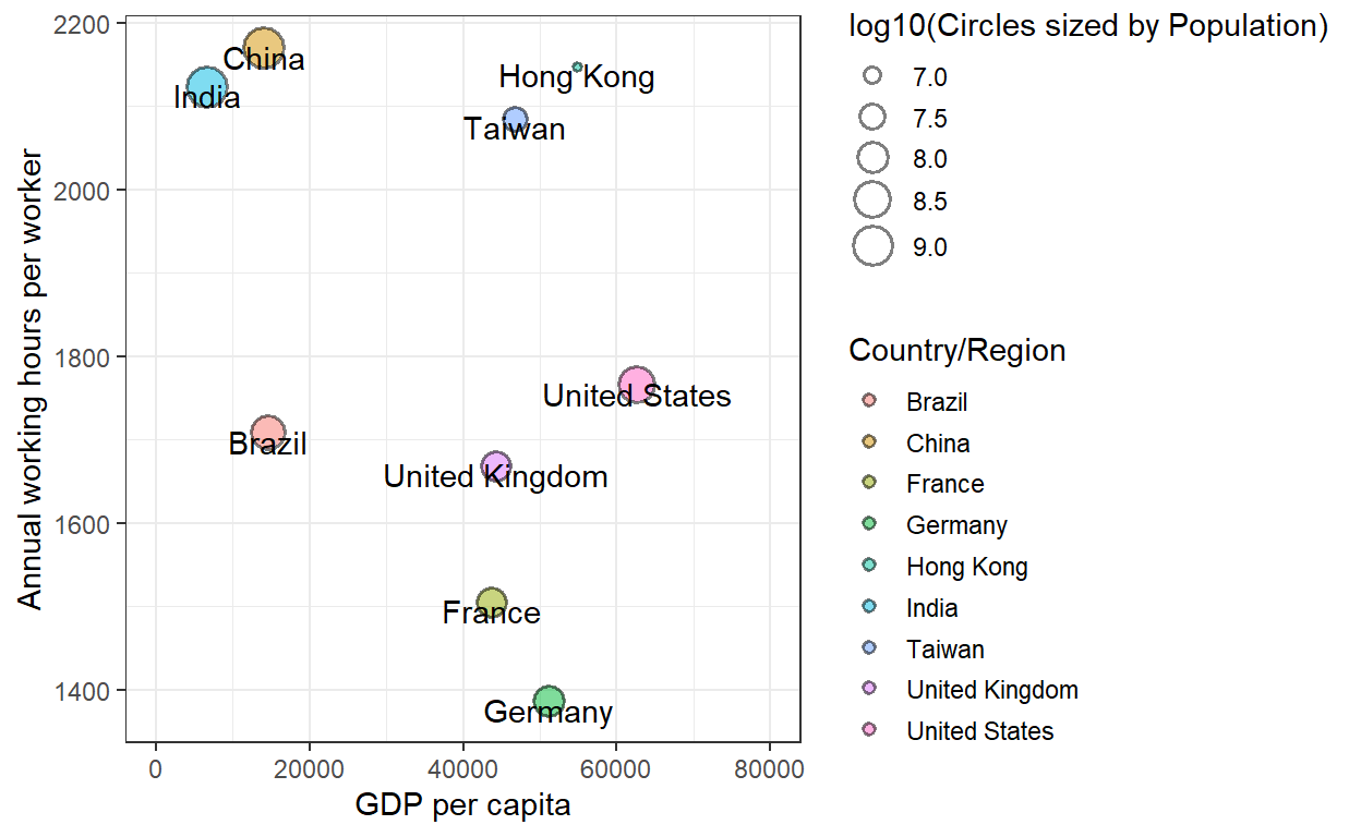 labs(x = 'GDP per capita', y = 'Annual working hours per worker',color="Country/Region") +