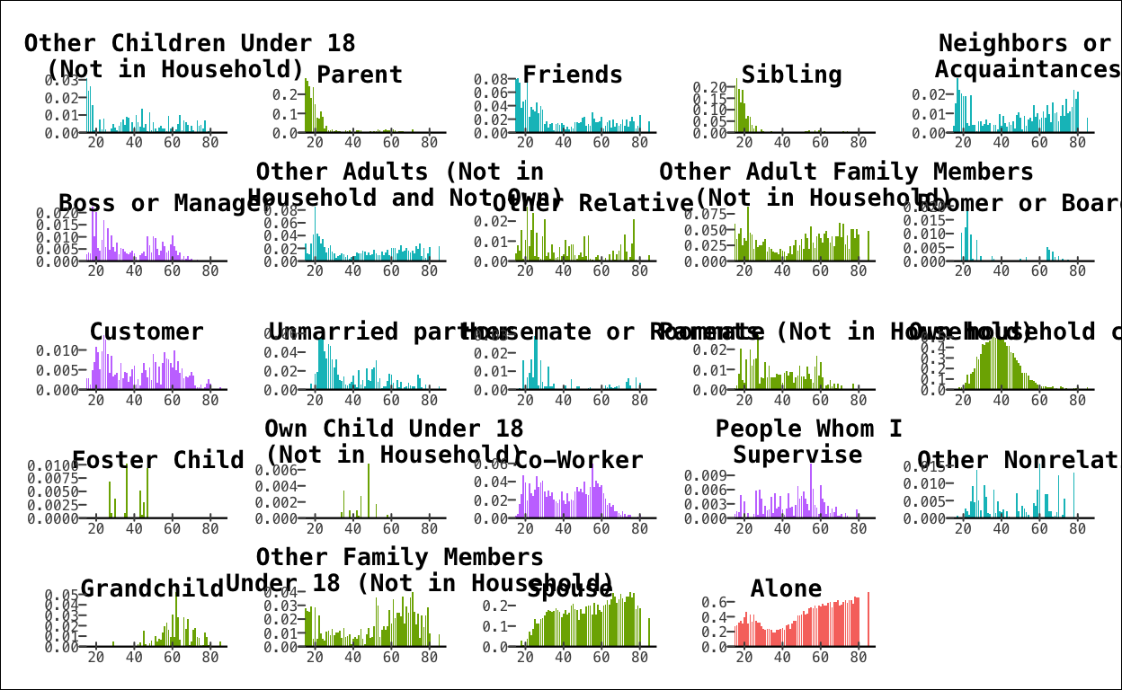 The point of the chart is to compare the distributions by age. The facets are sorted by peak age from youngest to oldest, meaning that “Parent” has a peak at minimum age. Meanwhile, the peak for “Neighbors or Acquaintances” is at the maximum age of 80, which is why its bar chart is positioned at the bottom right corner.
