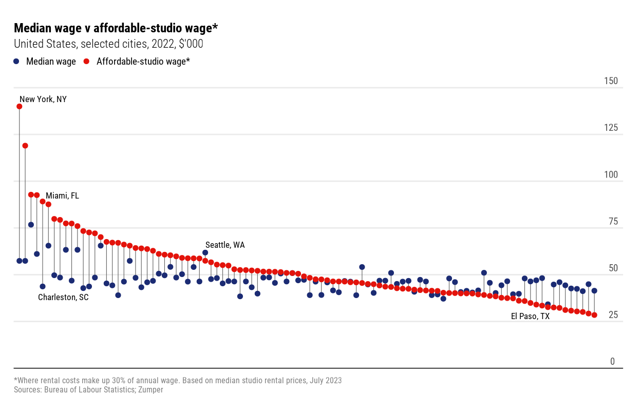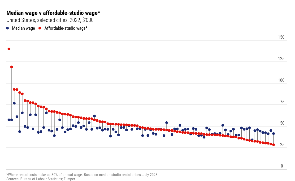 caption = "*Where rental costs make up 30% of annual wage. Based on median studio rental prices, July 2023\nSources: Bureau of Labour Statistics; Zumper"