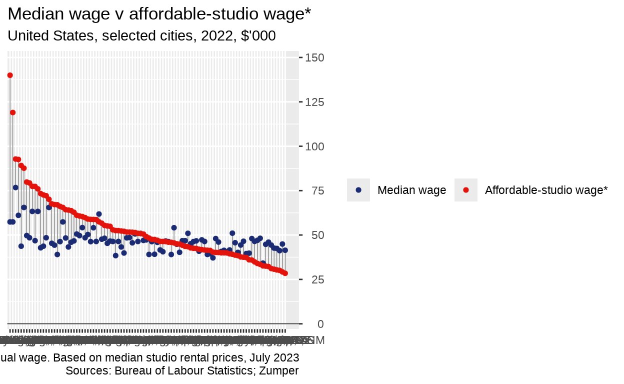 This double lollipop graph below, originally published by The Economist in 2023, compares the median wage to the affordable studio wage across cities in the United States. It highlights the growing housing affordability crisis and reveals where single renters face the greatest financial challenges. My objective is to recreate this graph as closely as possible using R, and then to propose an alternative visualization.