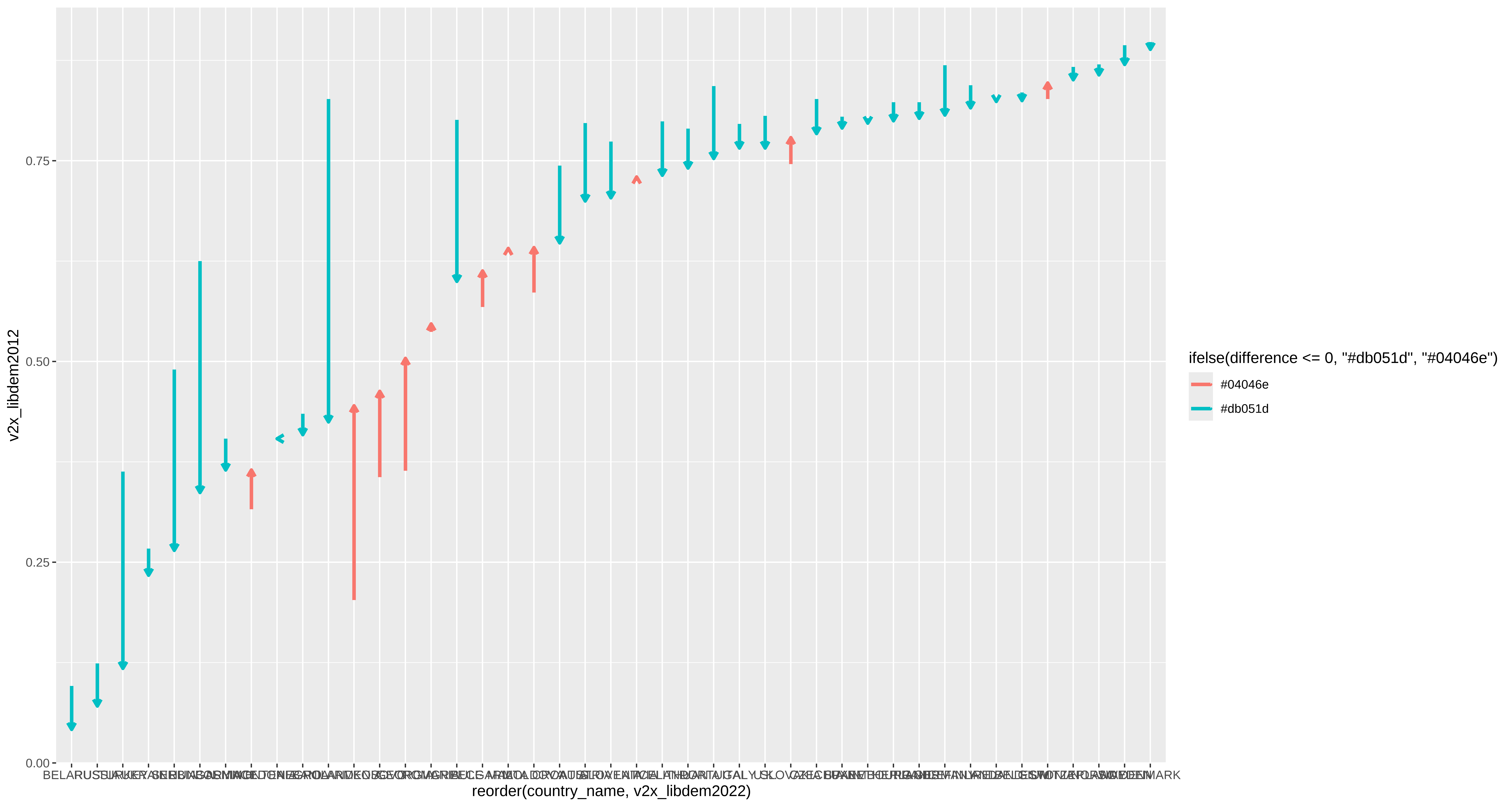 The main drawback of the alternative visualization, though, is that some data points appear “ugly”. This occurs for those countries whose democracy index changed little between 2012 and 2022, resulting in arrows that are barely visible.