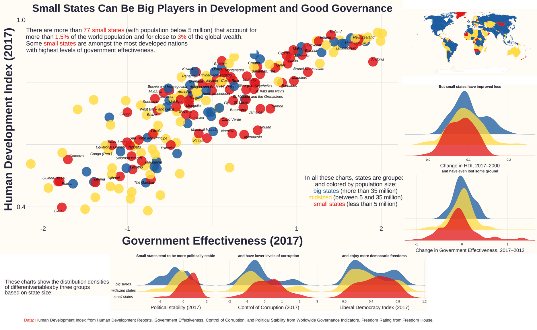 This project replicates the multi-panel visualization “Small States Can Be Big Players in Development and Good Governance”, originally produced for the World Data Visualization Prize. The original figure combines several international datasets to show how countries differ in human development, governance quality, political stability, corruption, and democratic freedoms, depending on their population size.