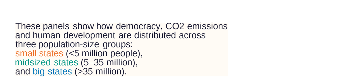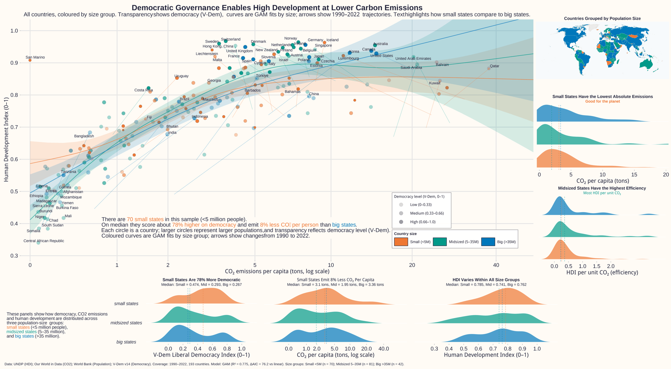 "Data: UNDP (HDI); Our World in Data (CO2); World Bank (Population); V-Dem v14 (Democracy). ",