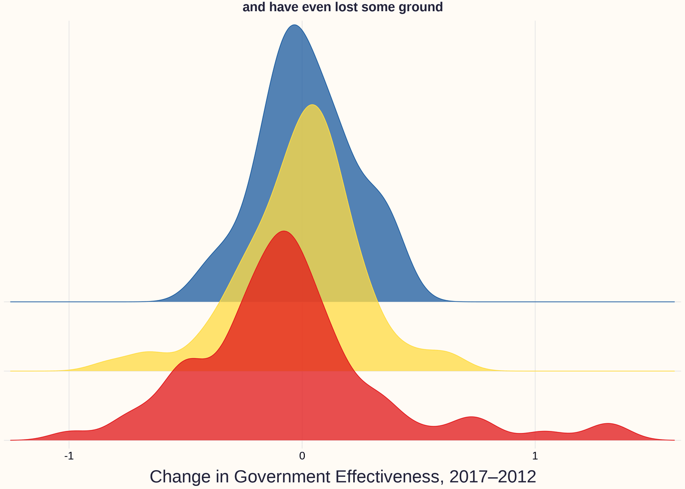 The main economic and governance indicators are taken from the World Bank’s World Development Indicators and Worldwide Governance Indicators. Using the wbstats package, the script downloads government effectiveness, political stability, control of corruption, GDP in purchasing-power-parity terms, GDP per capita, unemployment, and total population. The key years are 2007, 2012, and 2017, chosen to match the timing structure implied in the original figure. Human development scores come from the United Nations Development Programme’s Human Development Index time series. The project extracts HDI values for 2000 and 2017, which are then used to compute the change in HDI over that period. This change is later displayed in one of the ridge-density plots and helps capture long-term development trajectories.