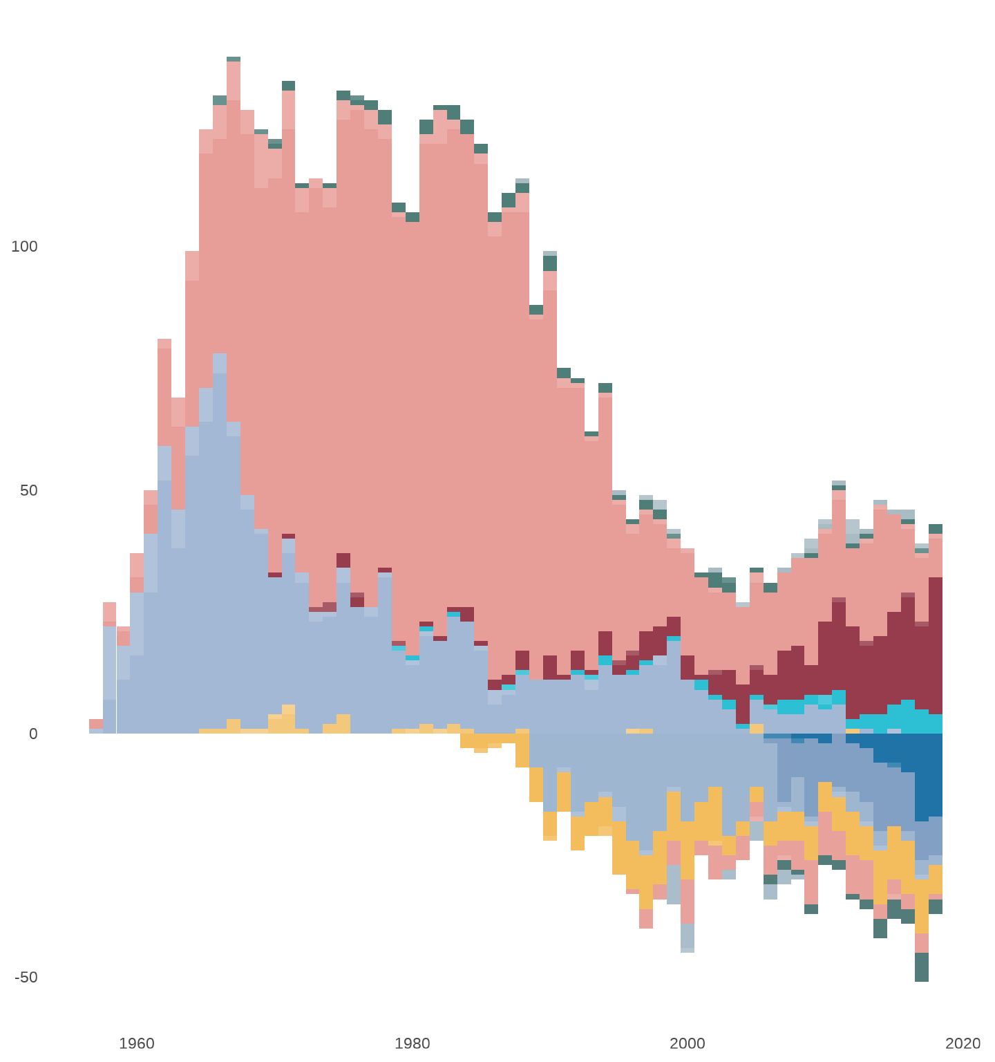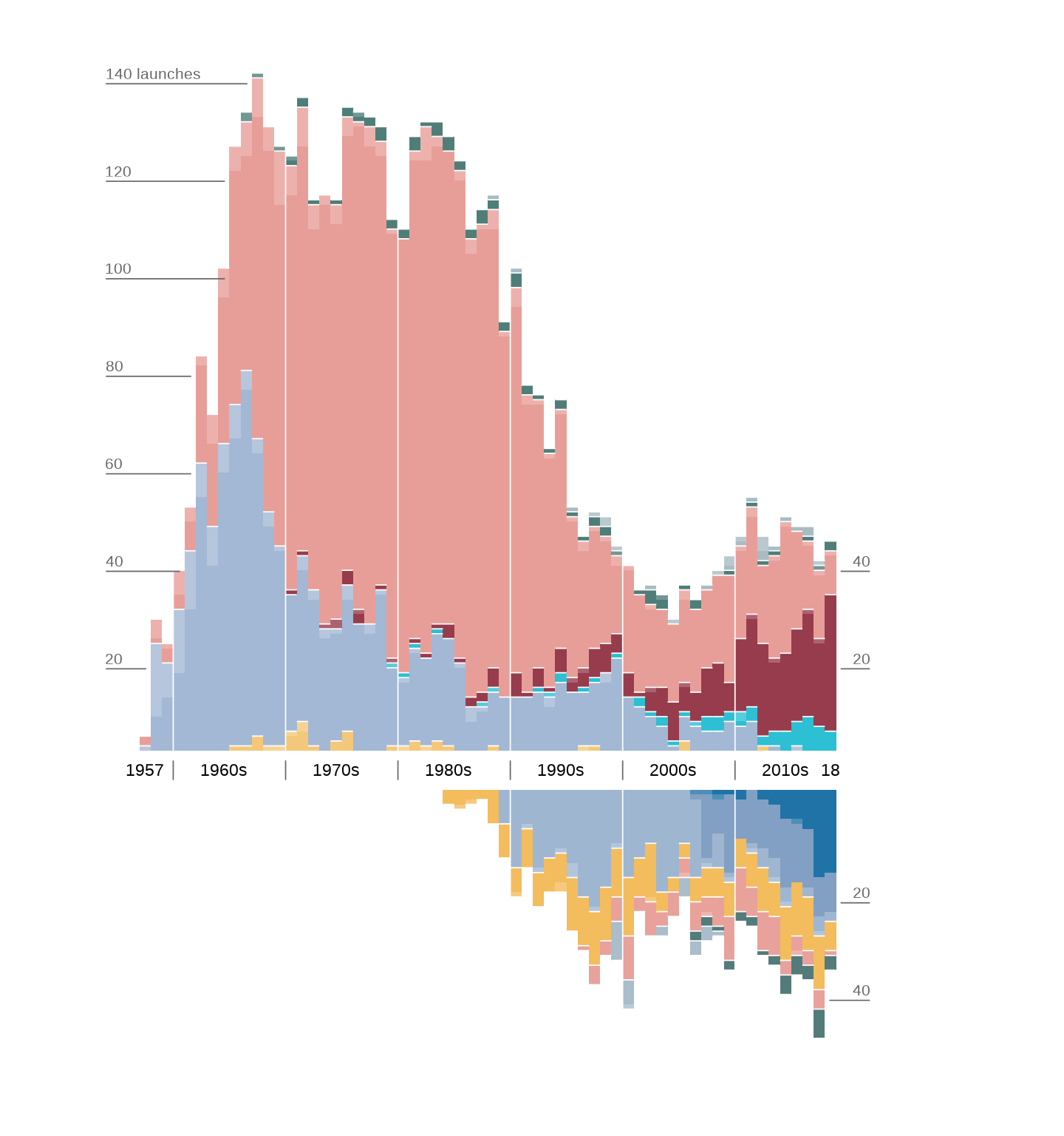 Finally, launches are aggregated by year and outcome. Commercial launches are assigned negative values, while state launches remain positive, creating a mirrored layout that clearly contrasts the decline of state dominance with the rise of commercial providers.