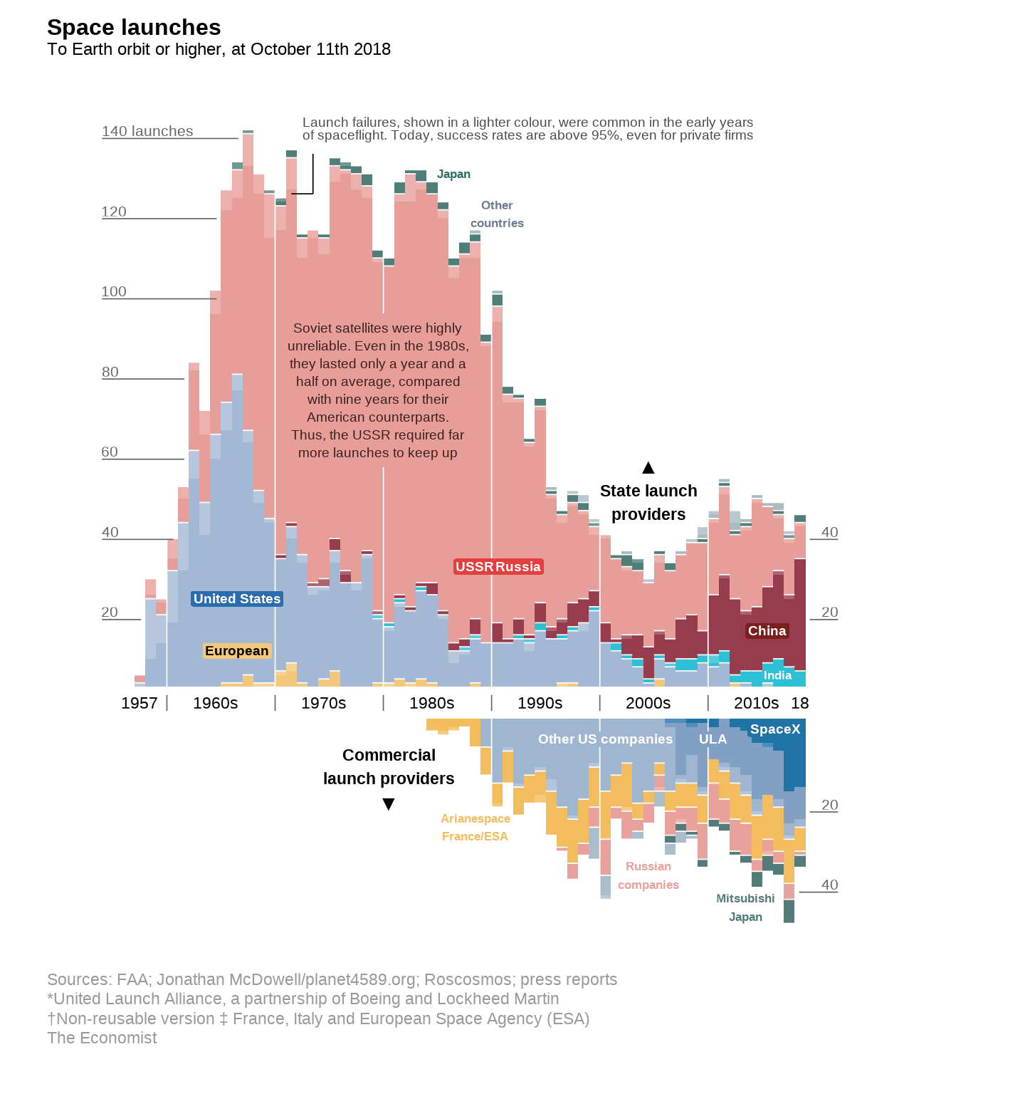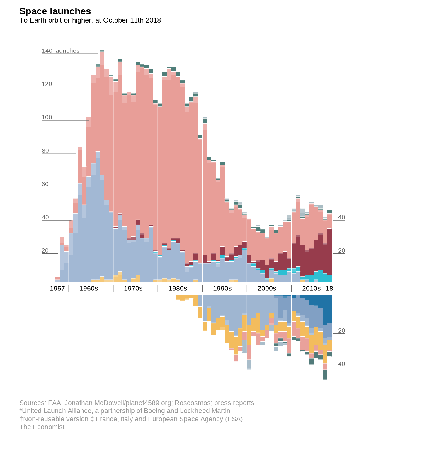 Once the exclusive domain of Cold War superpowers and their state-run space agencies, space launches have become increasingly driven by commercial companies and emerging nations. This shift is clearly captured in a visualization published in The Economist in October 2018, titled “The space race is dominated by new contenders,” which presents detailed space launch data from 1957 to 2018.