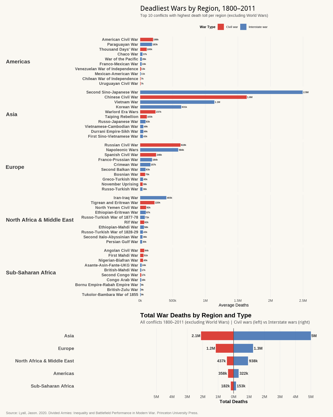 subtitle = "All conflicts 1800–2011 (excluding World Wars) | Civil wars (left) vs Interstate wars (right)",