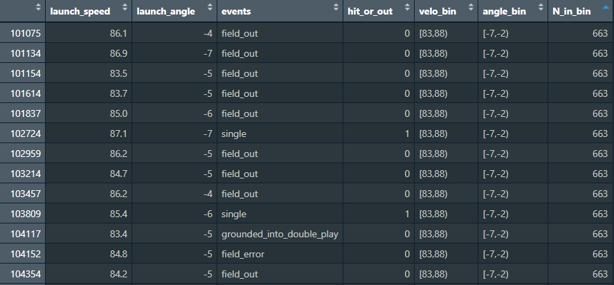 Next, I created the hit/out variable by interpreting the ‘events’ column. I also filtered to keep only balls labeled as ‘in play’ (type = X), as they are the only ones that can qualify as ‘hit’ or ‘out’.