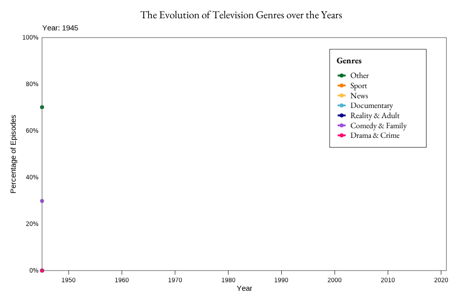 I therefore opted for an animated line chart, so that the viewer could follow the TV genres’ evolution over time, in a more interactive way that would show change in a very active manner. By following the lines in the chart, changes can be seen throughout the years (still placed as ticks in the x-axis). In my opinion, the way in which the original chart was grouping the genres was very confusing, with small groups of random genres that contributed to the graph’s messiness (e.g. “Drama & Family & Romance or Comedy & Music & Talk Show). I changed approach and decided to reduce the labels, by creating bigger groups of more general genres. I believed that this was going to make the graph clearer and, while some information might be lost, at least the visualization would gain clarity, deeply missing in the original version.